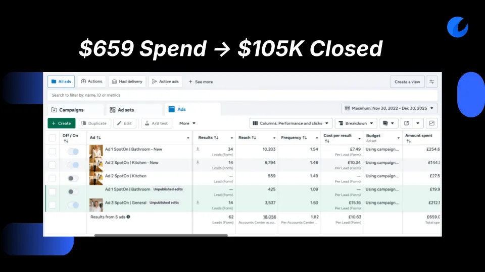 Using advanced Meta targeting, we test multiple creative formats—AI-generated UGC, action-based videos, and performance statics—to find fast winners. Once we identify what’s converting, we scale aggressively to fill your funnel with consistent, qualified demand.